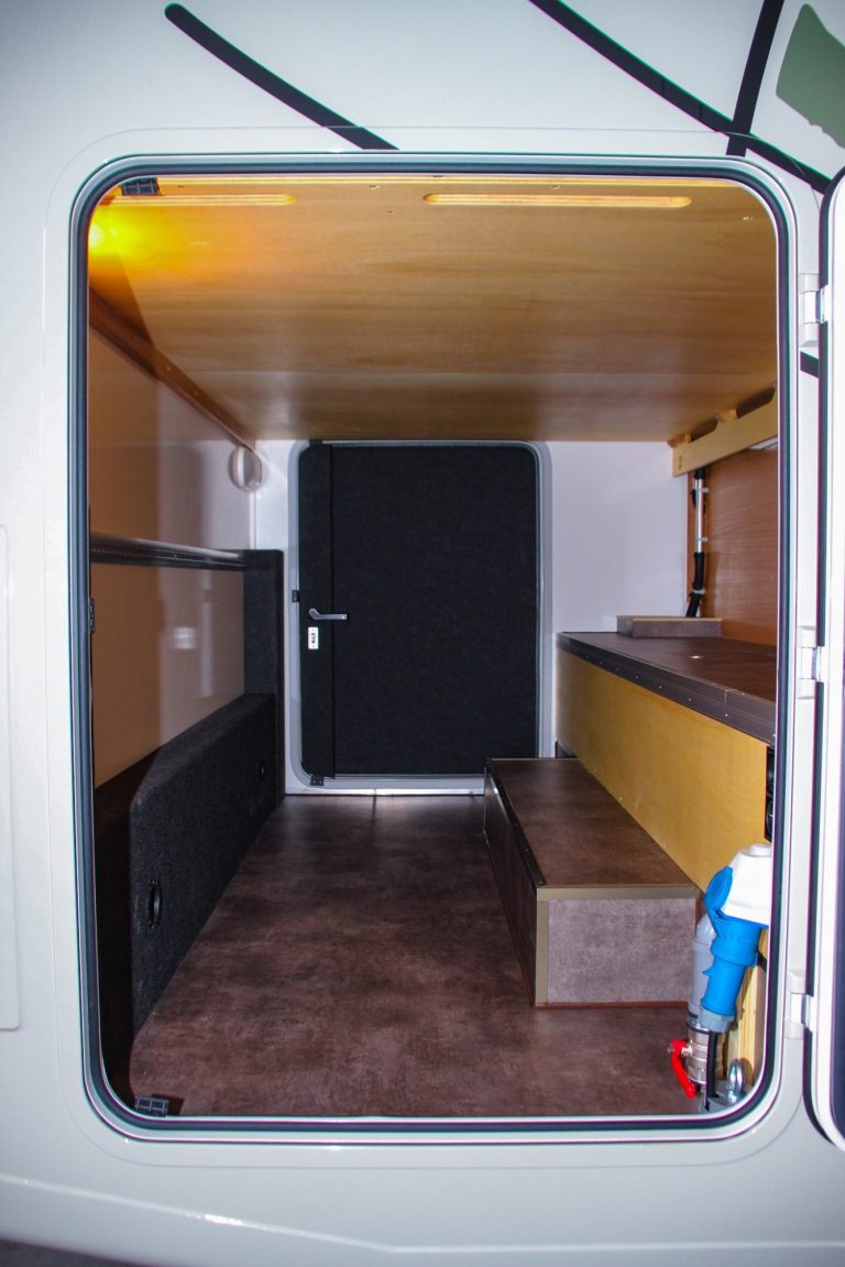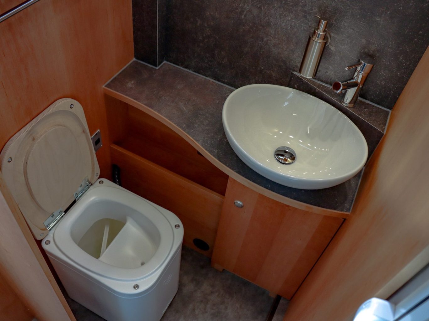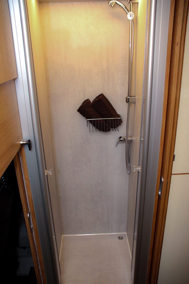Separate Dusche, Waschplatz in Haushaltsqualität und Trockentrenntoilette mit SOG-Entlüftung machen das Bad zum vollwertigen Rückzugsort. Frostsichere Tanks und ALDE-Warmwassertechnik sichern diesen Komfort zu jeder Jahreszeit.
