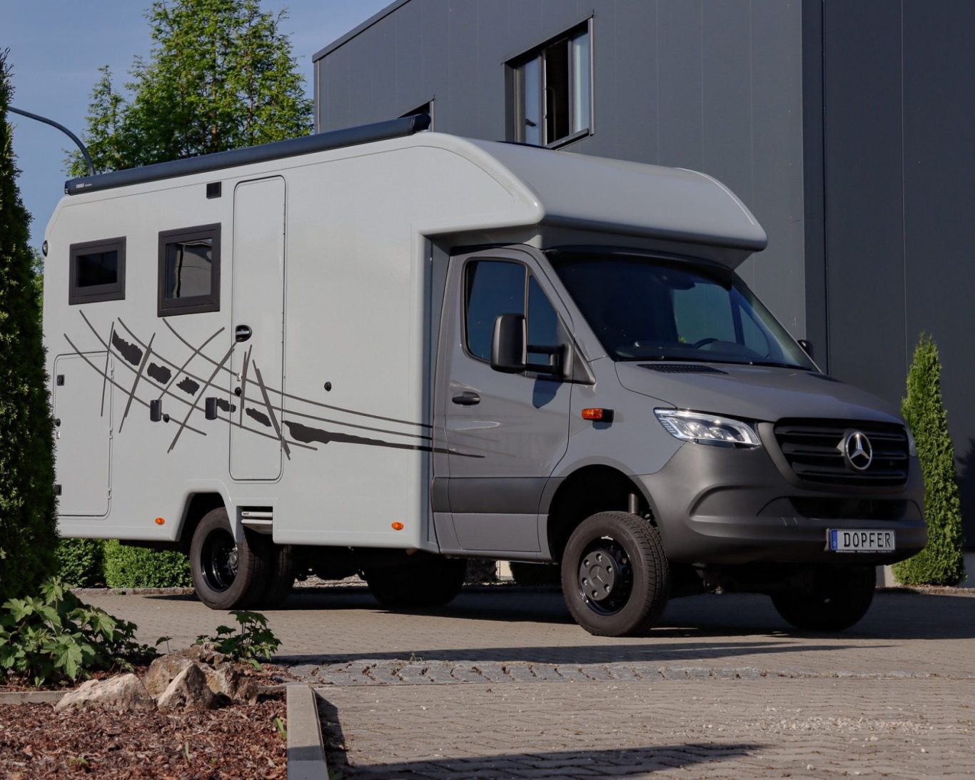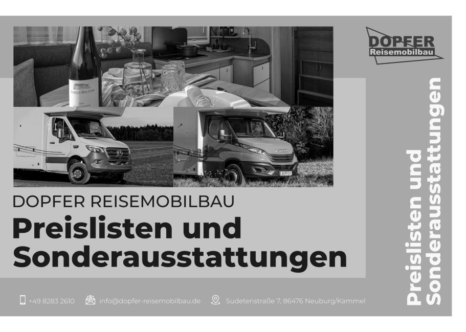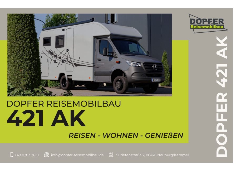 Der DOPFER 421 AK verbindet unter drei Metern Außenhöhe großen Wohnkompfort mit festem Heckbett, cleverer Sitzgruppe und Raumbad. Echtholzmöbel, große Tanks und ALDE-Heizung machen ihn zum kompakten Reisemobil für lange Touren.
