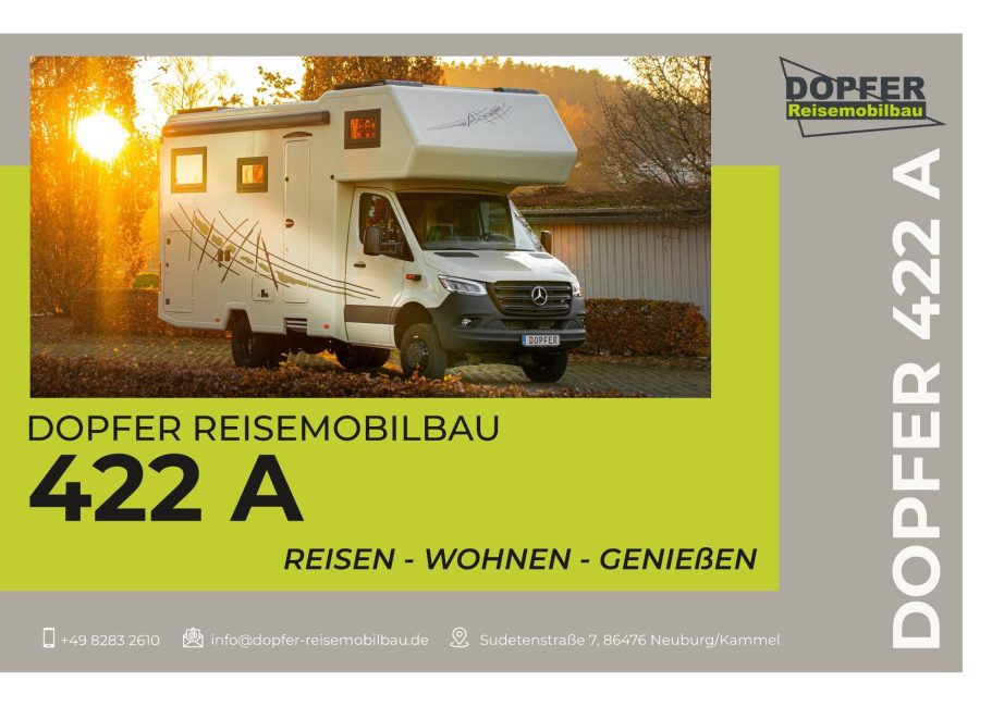 Der DOPFER 422 A verbindet kompakte Außenlänge mit großzügiger Heckrundsitzgruppe, Längsalkoven und beheiztem Doppelboden. Echtholzmöbel und moderne Technik machen ihn zum idealen Begleiter für lange Reisen zu zweit oder mit Gästen.