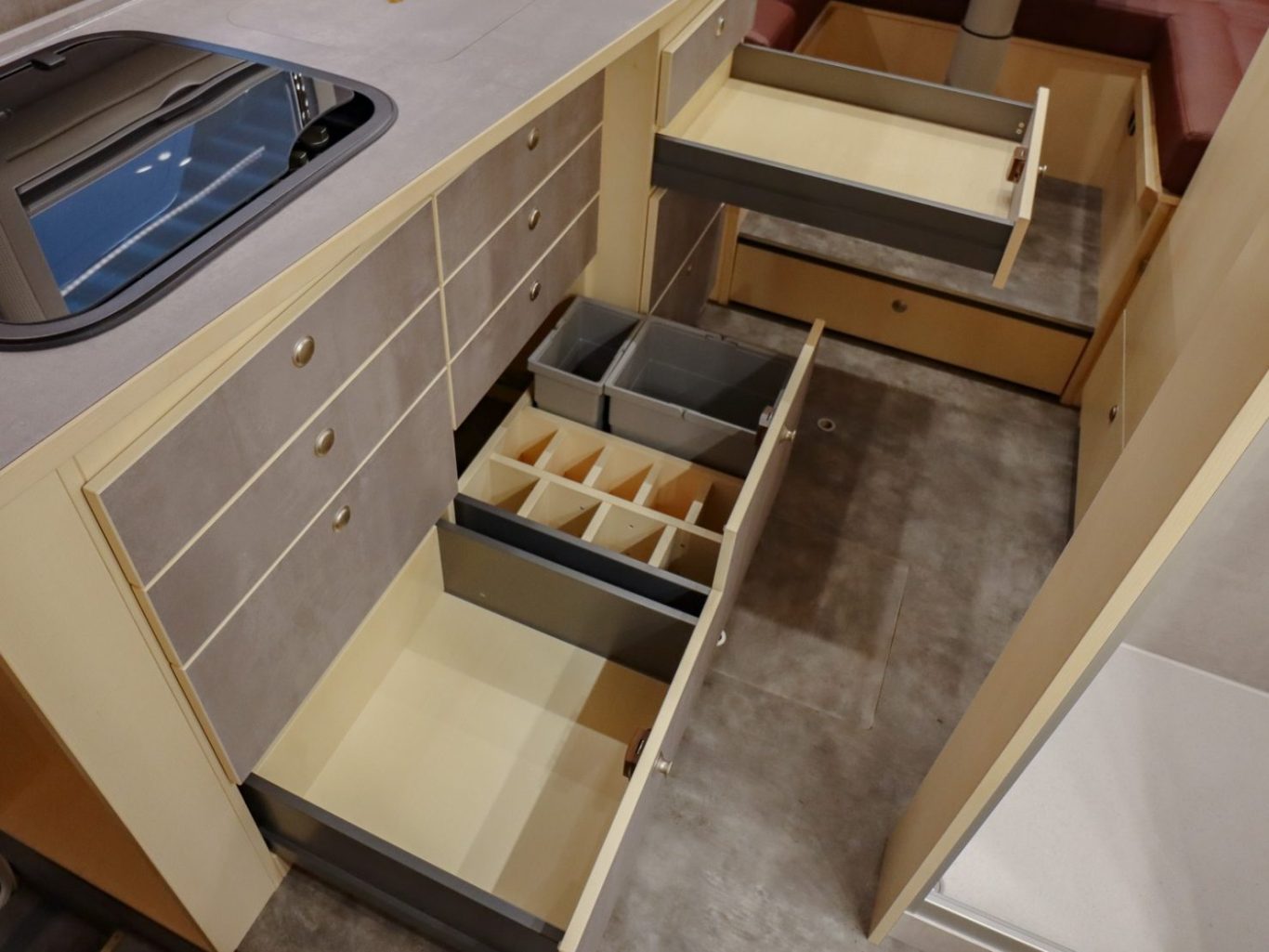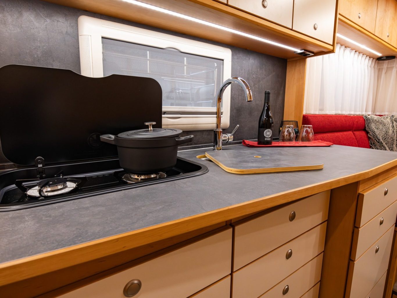 Große Arbeitsfläche, zündgesicherter Gasherd, Edelstahlspüle und tiefe Vollauszüge machen die Küche zum Lieblingsplatz für Genießer. Der 130-Liter-Kompressorkühlschrank und gute Belüftung runden das Kochvergnügen unterwegs ab.